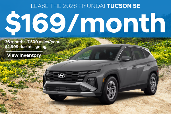 Lease a New 2026 Hyundai Tucson SE AWD for as low as $169/month. 36 months. 7500 miles per year. $2,999 due at signing. Example: H9392 VIN: TH696736 MSRP: $32.790 Must finance through Hyundai Motors Financial (HMF). For well-qualified buyers only, payment does not include taxes, tags, dealer doc fee or manufacturer acquisition fee. Offer ends 04/30/2026