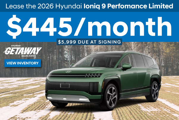 Lease A New 2026 Hyundai Ioniq 9 for $445/month $5,999 due at signing. 36 months 7500 miles per year. (H9167) Must finance through Hyundai Motors Financial (HMF). For well-qualified buyers only, payment does not include taxes, tags, dealer doc fee or manufacturer acquisition fee. Offer ends 03/31/2026